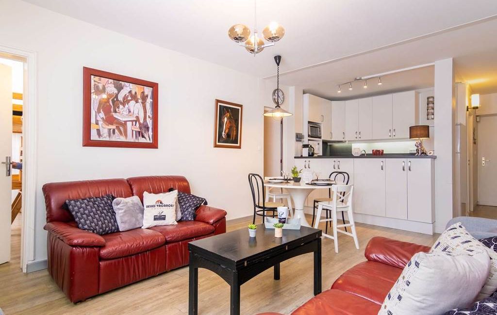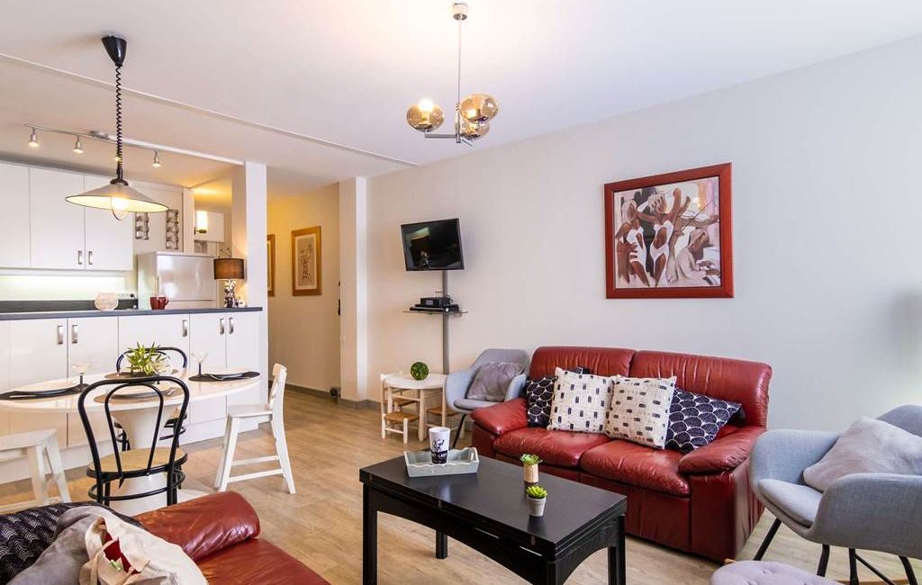 A living room with an open-plan, modern, fully-equipped kitchen.