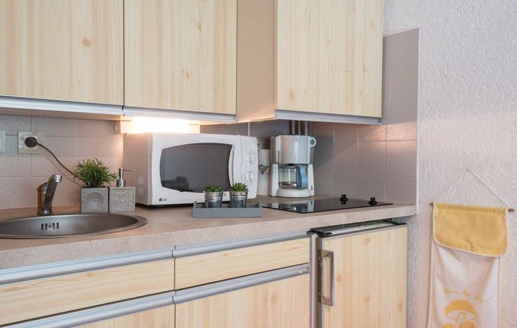 Kitchen area with mini-oven and microwave overlooking the living room.