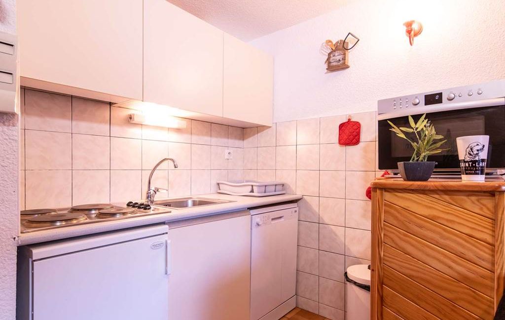 A fully-equipped kitchenette opening onto the living room (4-burner electric hob, electric oven + microwave + washing machine)