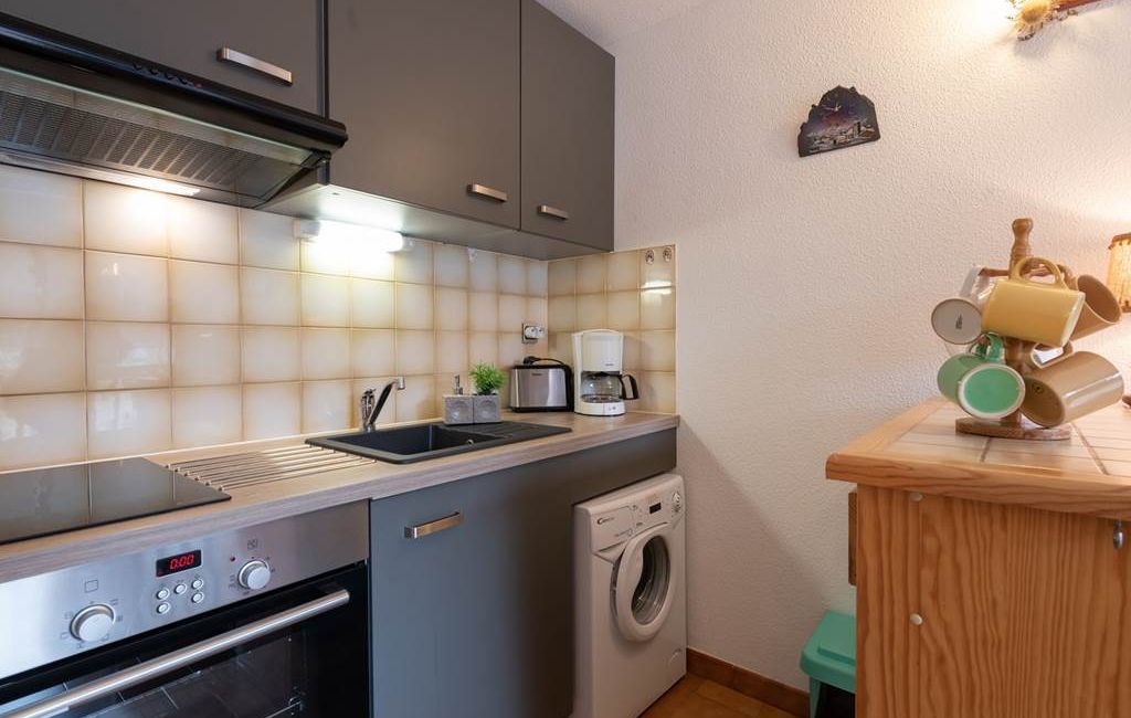 Kitchen area equipped with mini-oven and microwave, freezer, washing machine.