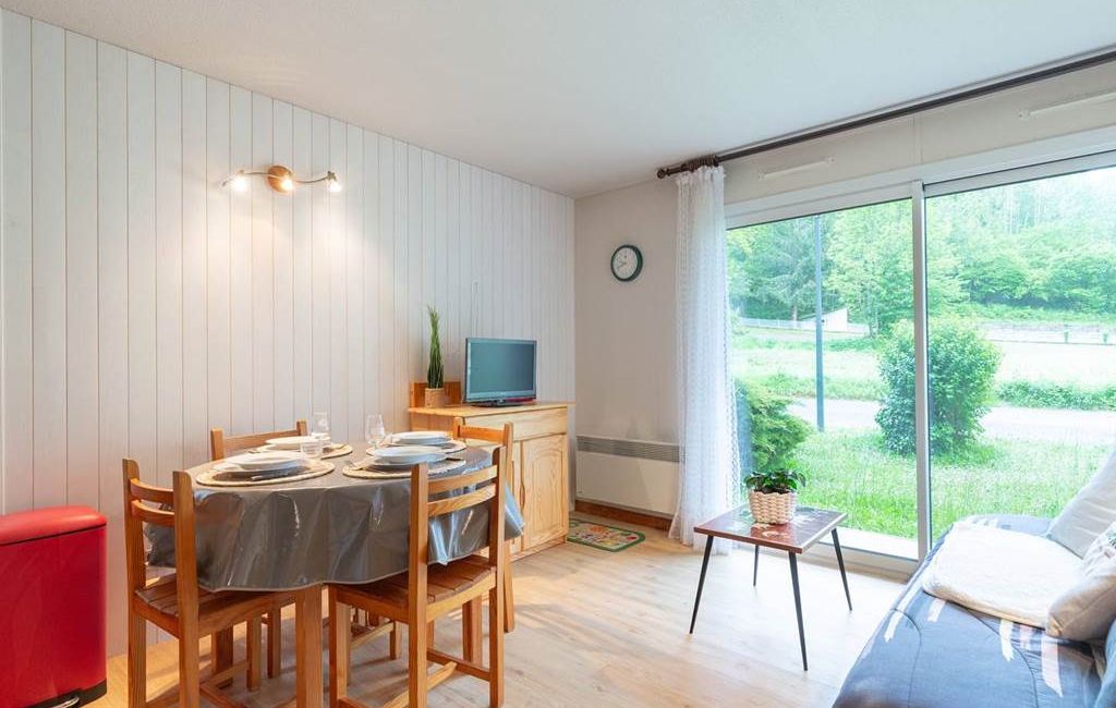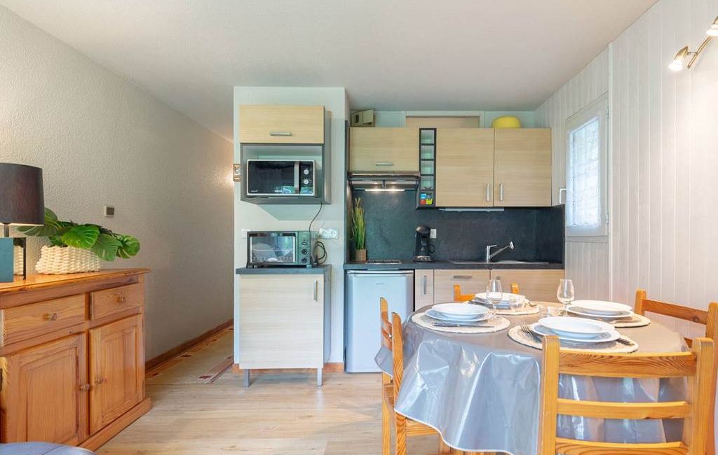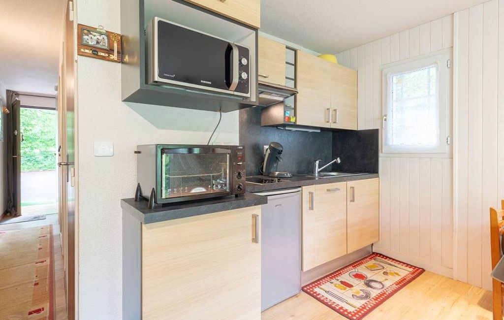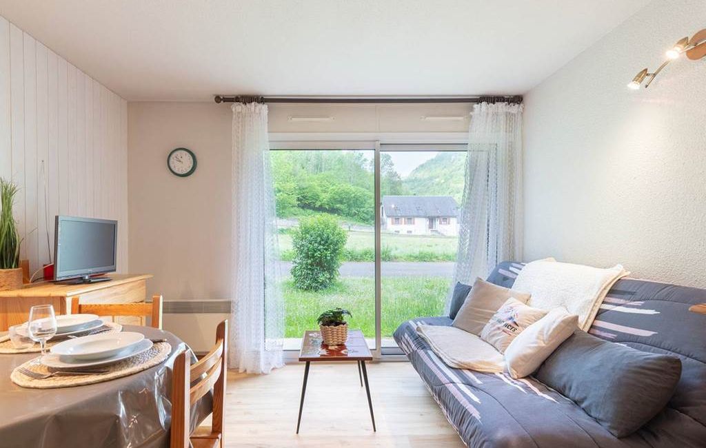 A large south-facing bay window floods the living room with natural light and gives access to a small sunny terrace, perfect for relaxing after a day in the mountains.