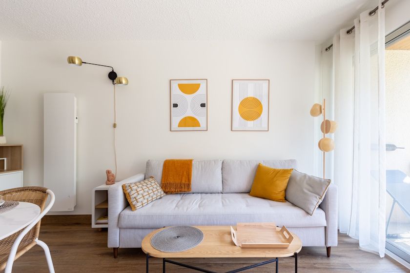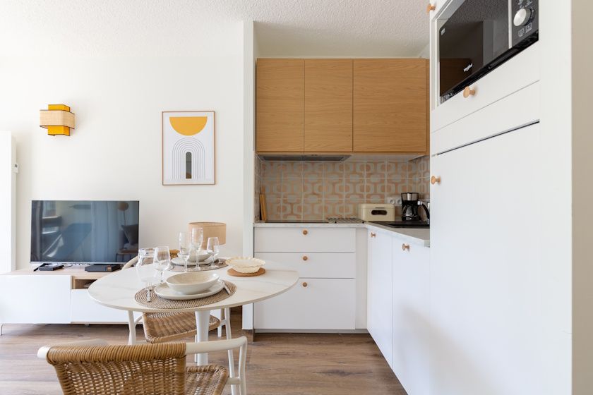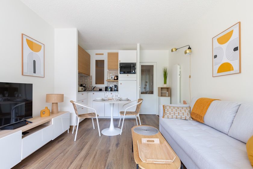 Bright living area with fitted kitchen, dining area and lounge opening onto the balcony, sofa bed.