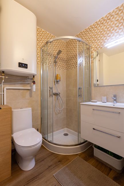Shower room with shower, washing machine and WC.