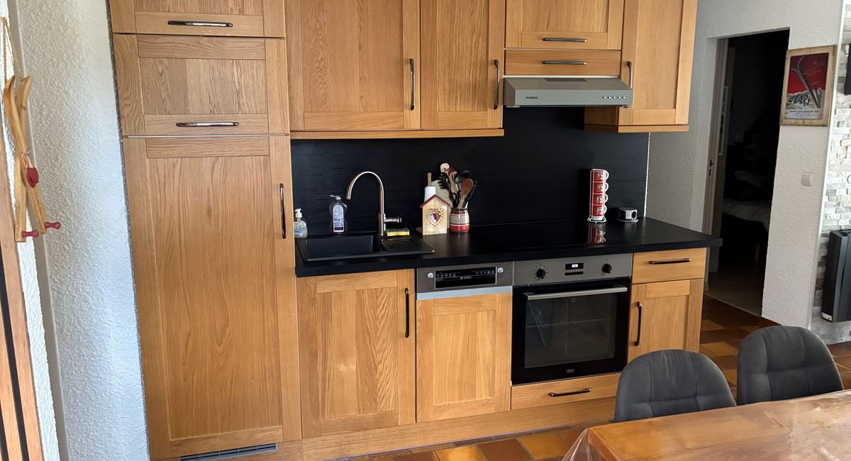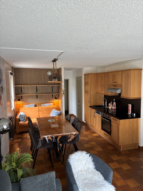 - A large living room with a fully-equipped kitchen, a sitting area with a 140x190 sofa bed, a 50" television and a sofa bed.