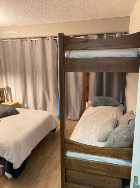 - Bedroom with a 140x190 bed and 1 80x190 bunk bed, including a dressing area and cot