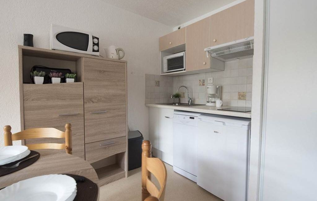 Una cocina americana abierta al salón (con mini-horno y microondas, 1 placa vitrocerámica (3 fuegos), lavavajillas)
