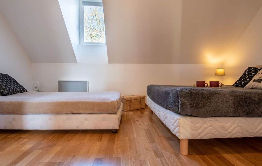 Un dormitorio con 1 cama doble (140cm) y 1 cama individual (90cm).