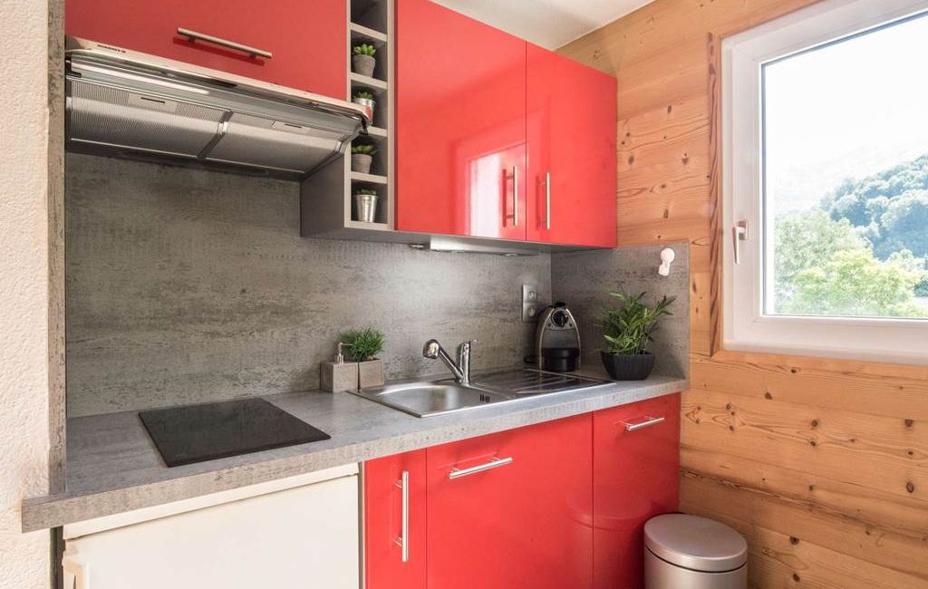 Cocina americana totalmente equipada abierta al salón (microondas, lavavajillas, cafetera Nespresso).