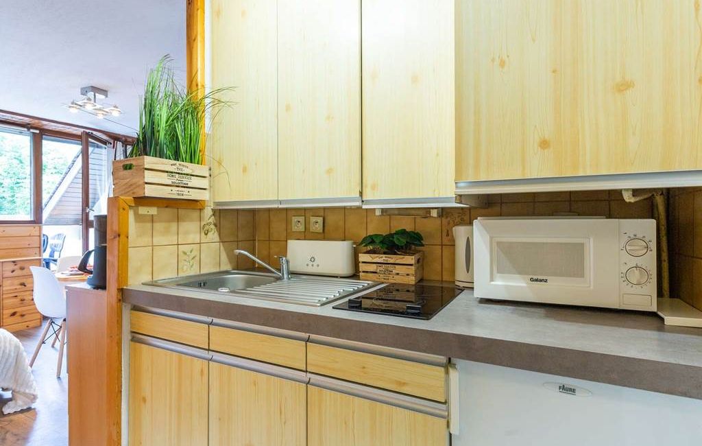 Una cocina americana totalmente equipada y un cuarto de baño con WC.