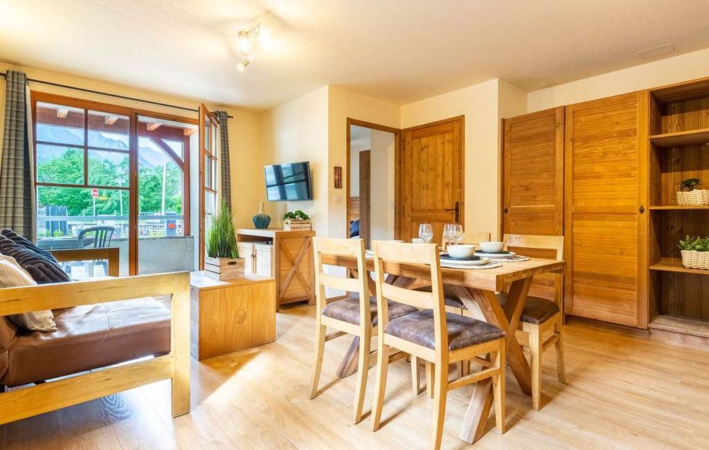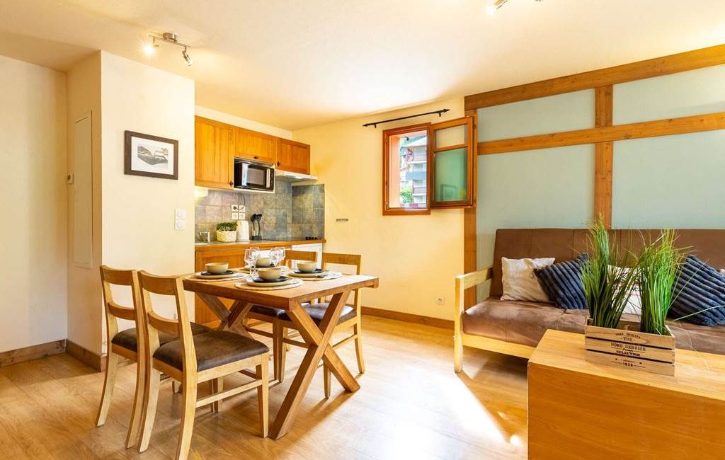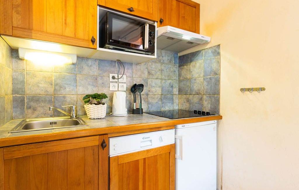 -Una sala de estar con 1 sofá cama para 2 personas y TV, abierta a una cocina totalmente equipada (vitrocerámica, microondas, lavavajillas).