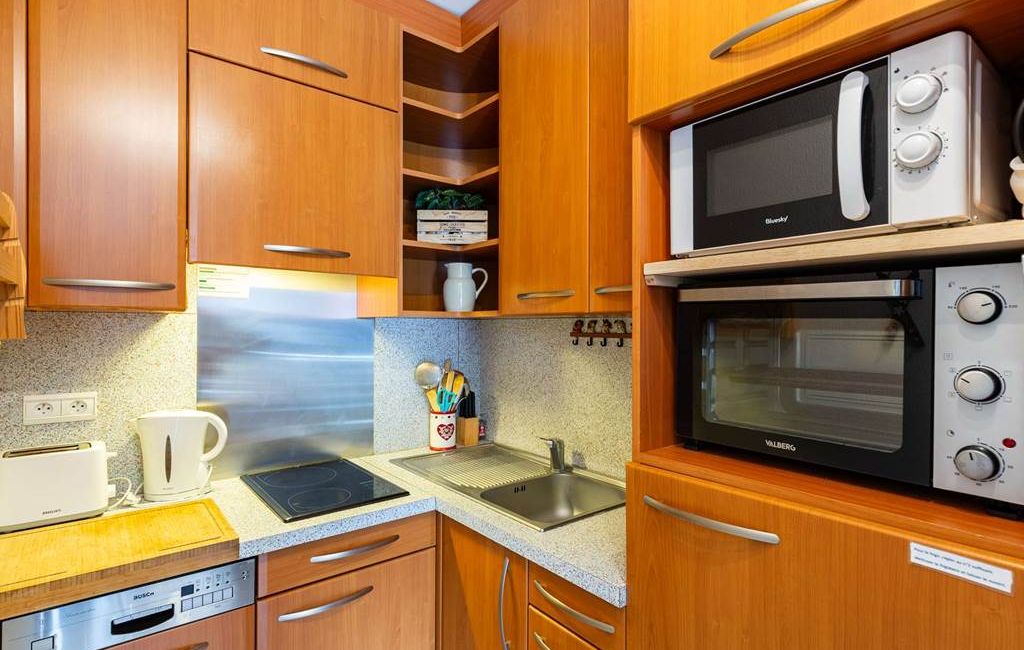 Cocina abierta, moderna y totalmente equipada: vitrocerámica, horno, lavavajillas, congelador, vajilla y cubertería.