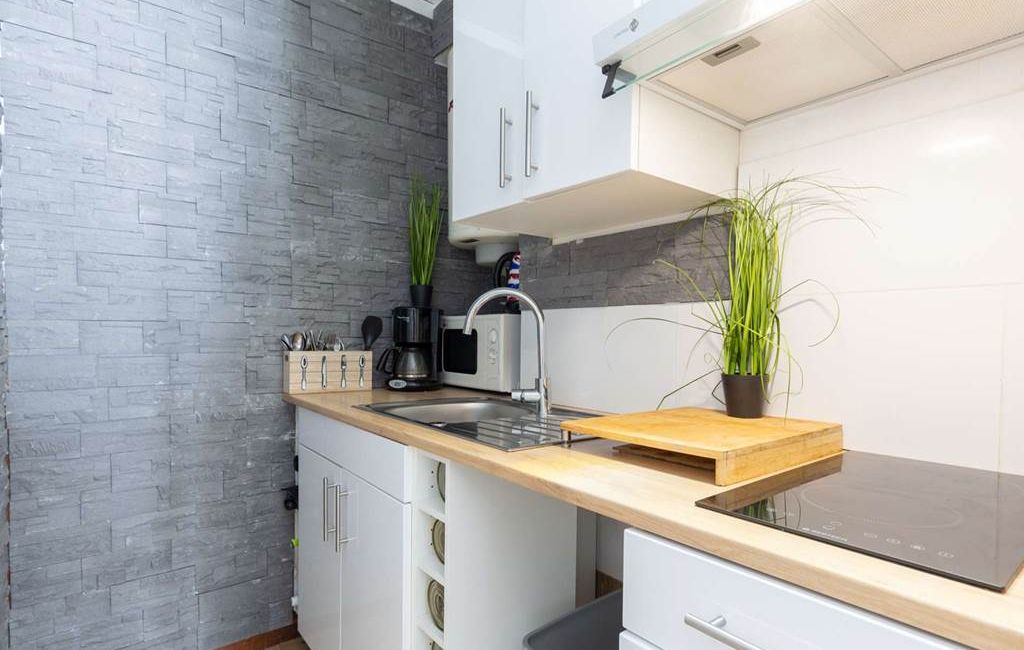 cocina americana totalmente equipada que da a una acogedora sala de estar