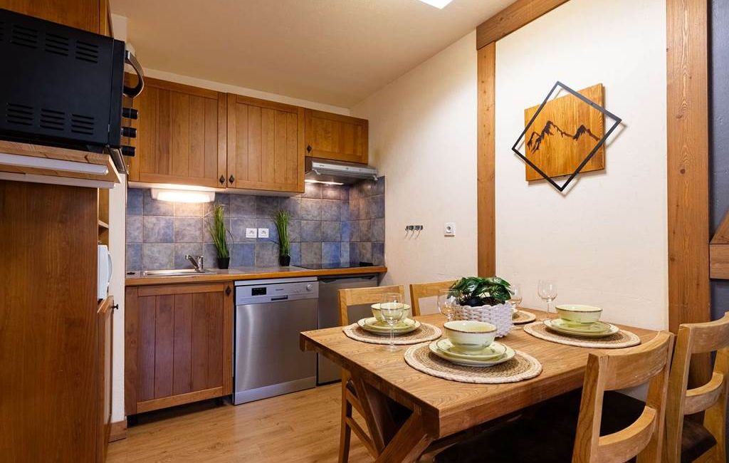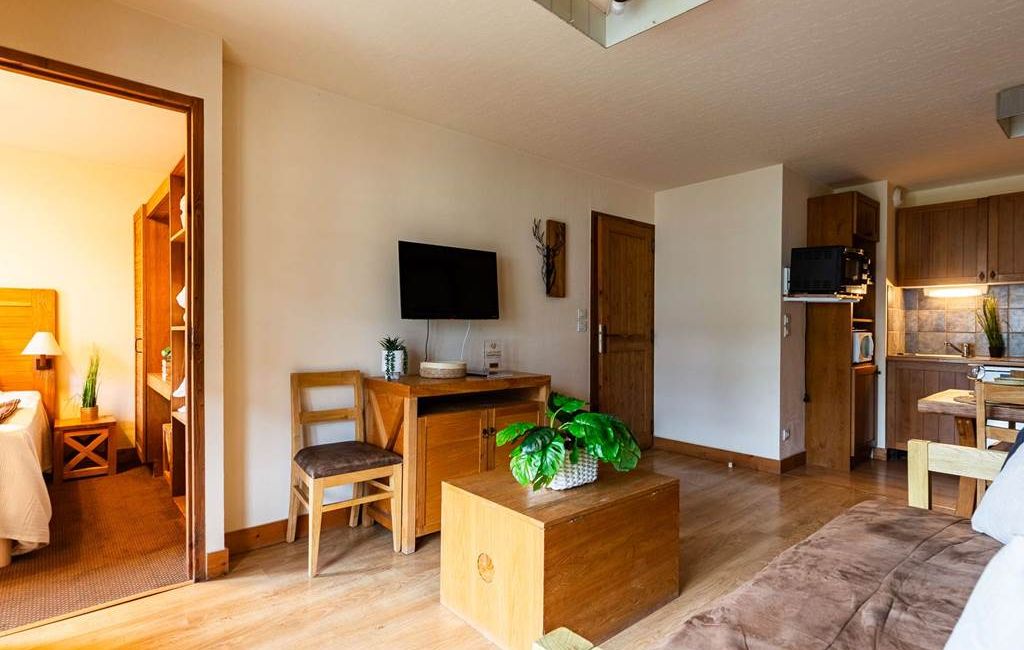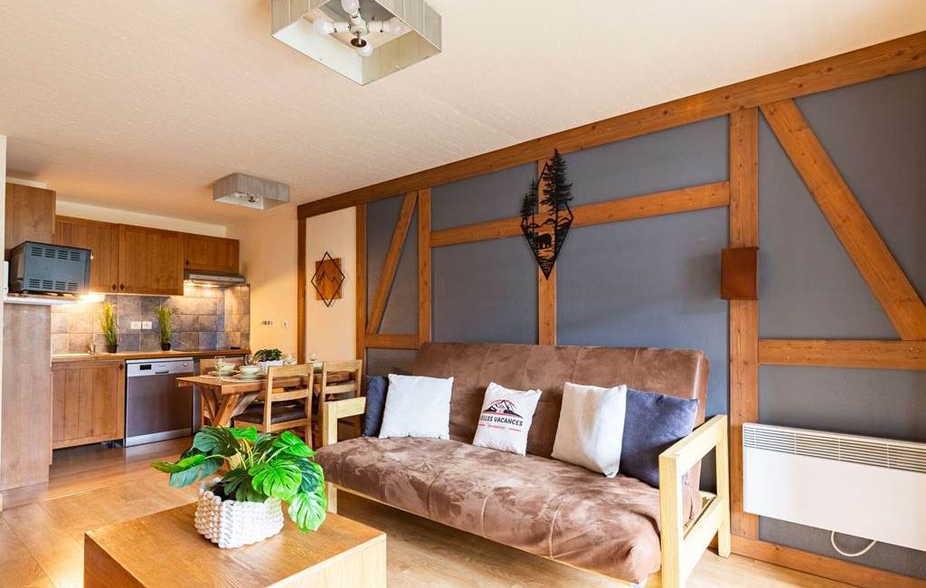 -Un séjour avec 1 canapé-lit gigogne 2 places et TV , ouvert sur une Cuisine équipée (plaques vitrocéramique, micro-ondes, lave-vaisselle)