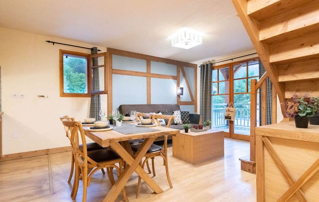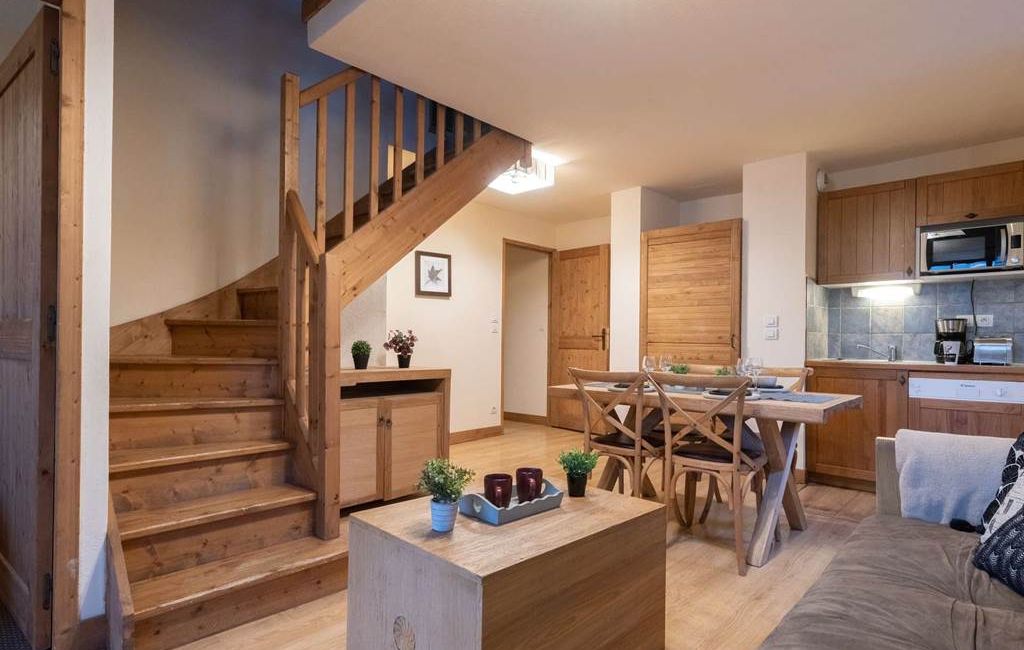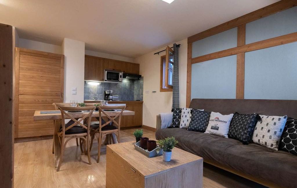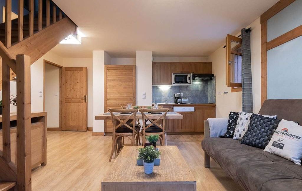 -Un séjour avec 1 canapé convertible 2 places et TV , ouvert sur une Cuisine équipée (plaques vitrocéramique, micro-ondes, lave-vaisselle)