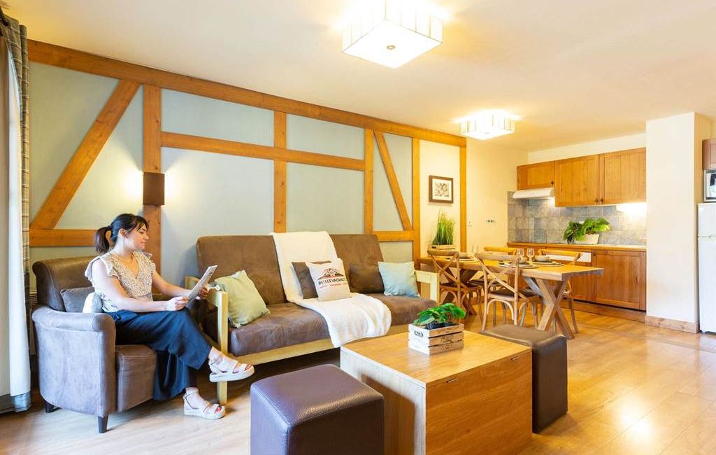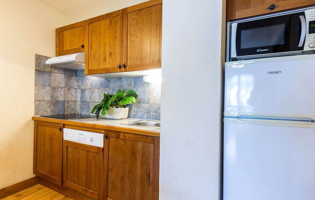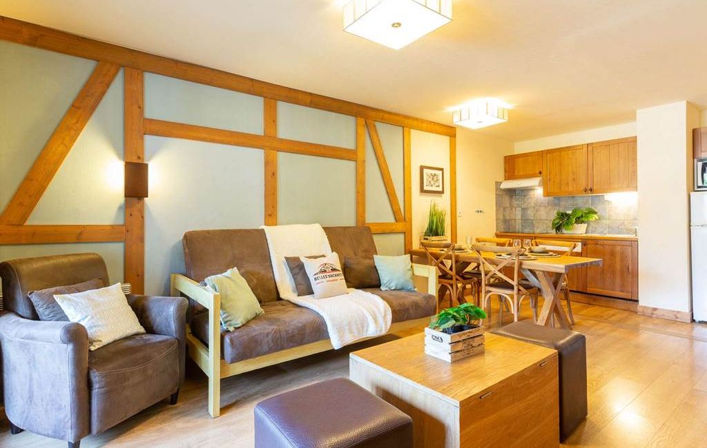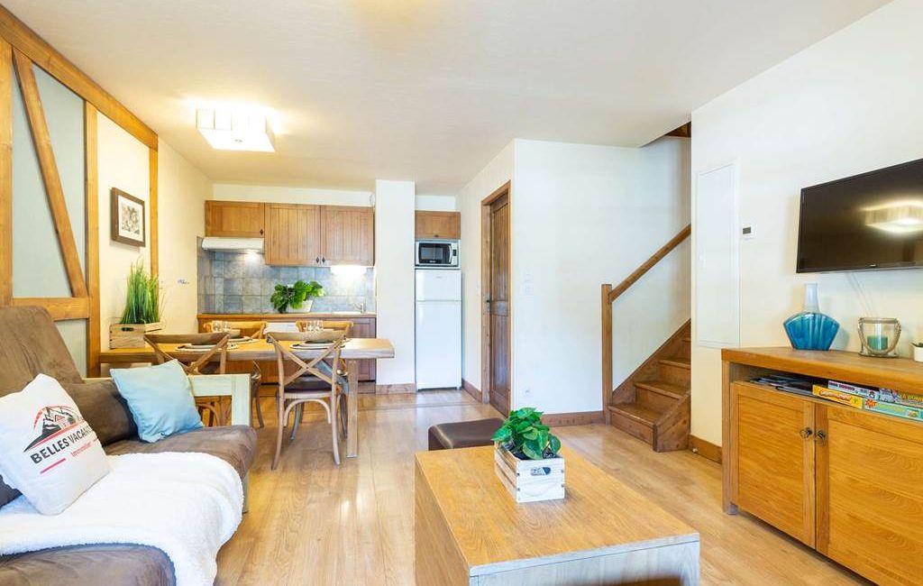 -Un séjour avec 1 canapé-lit gigogne 2 places et TV , ouvert sur une Cuisine équipée (plaques vitrocéramique, micro-ondes, lave-vaisselle)