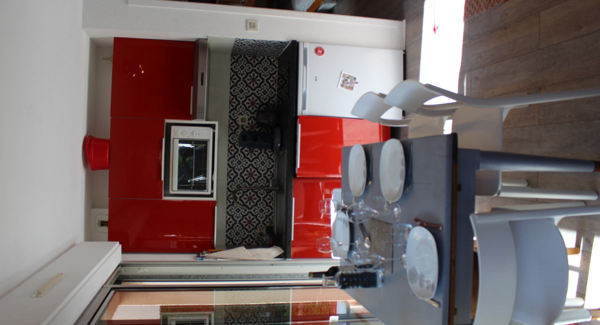 • Séjour : Cuisine entièrement équipée (lave-vaisselle), table, chaises, placard avec sèche-chaussures intégré, télévision, chaîne hi-fi, canapé-lit, meubles de rangement