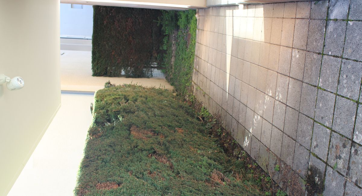 • Terrasse couverte devant le séjour entourée d’une haie de sapinettes
