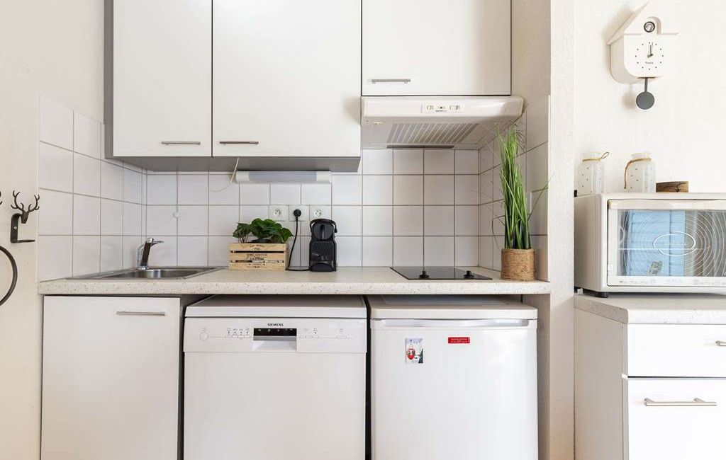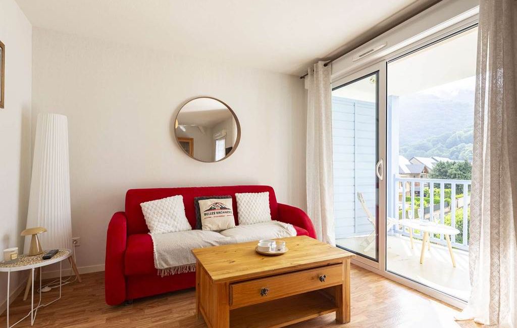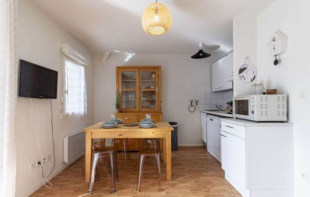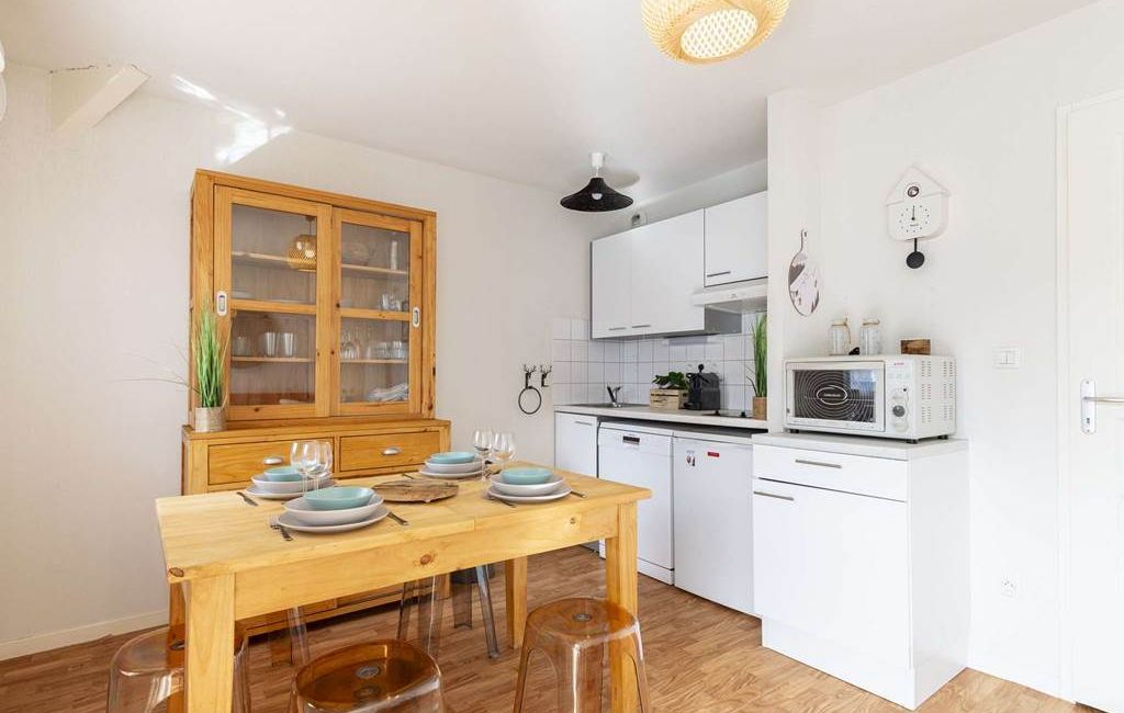 Il se compose d’une chambre avec un lit double (140x190), d’un coin nuit avec lits superposés (90x190), d’une salle d’eau moderne avec lave-linge, et d’une belle pièce de vie conviviale avec cuisine ouverte équipée donnant sur un séjour lumineux. Le tout s’ouvre sur un balcon exposé ouest, parfait pour profiter du soleil en fin de journée.