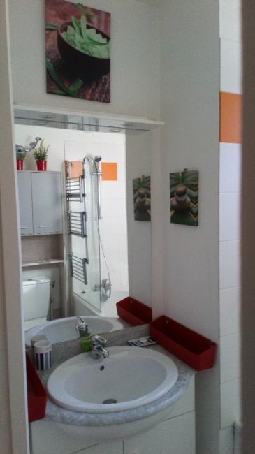 Cuisine équipée tout confort avec plaques induction, grand frigo et congélateur, lave linge et sèche linge.